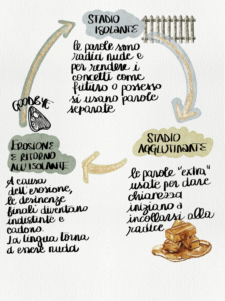 Molte lingue iniziano come analitiche in uno stadio che si chiama isolante (con parole separate, come l’arabo). Col tempo, le parole usate spesso insieme si incollano permettendo un notevole risparmio cognitivo. La lingua, a sua volta, diventa agglutinante o composta, (come il tedesco).